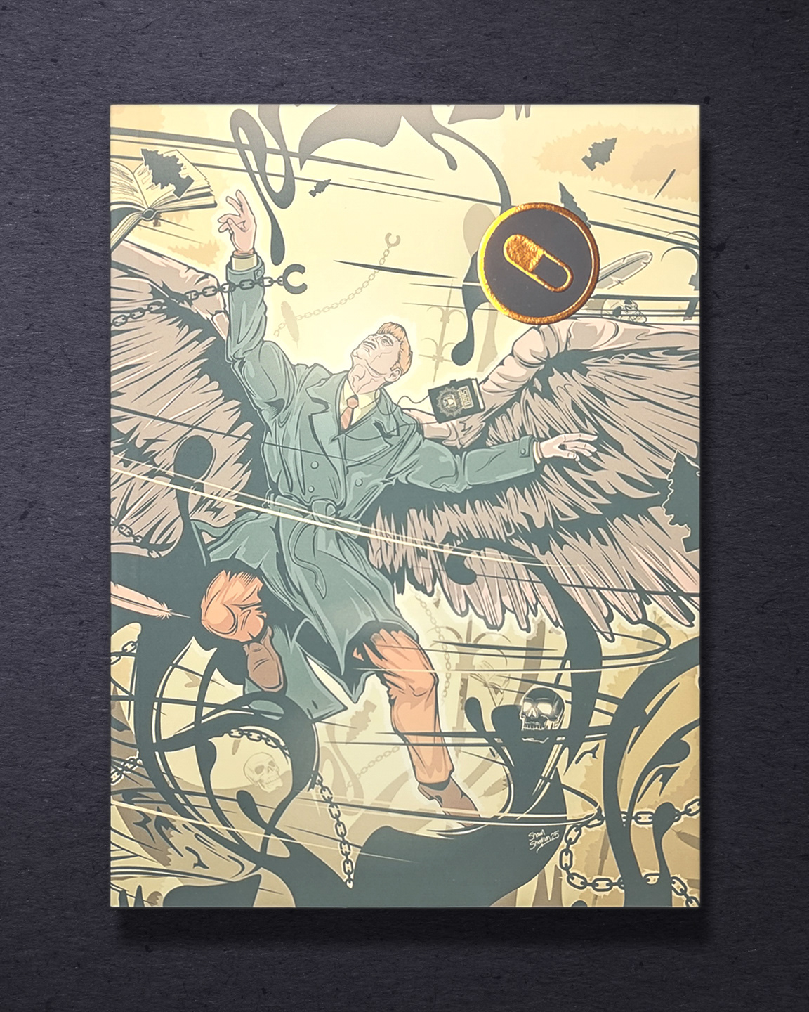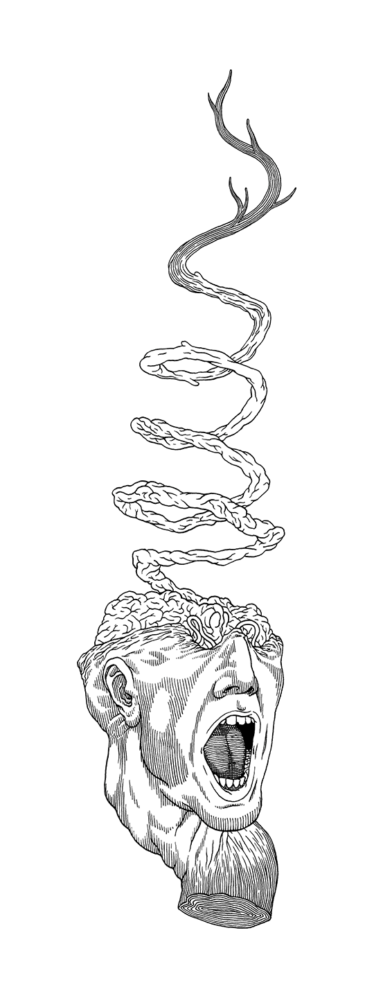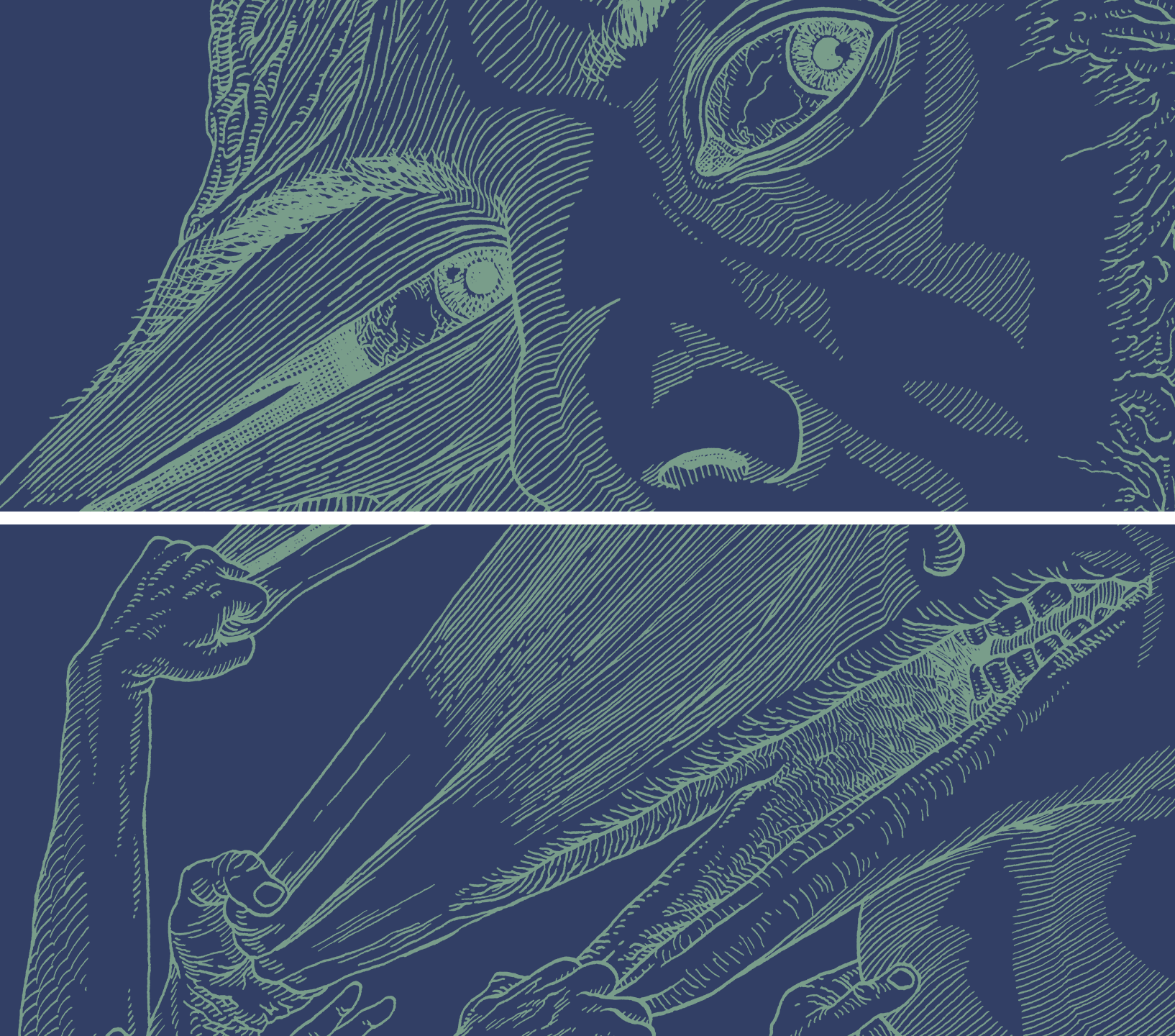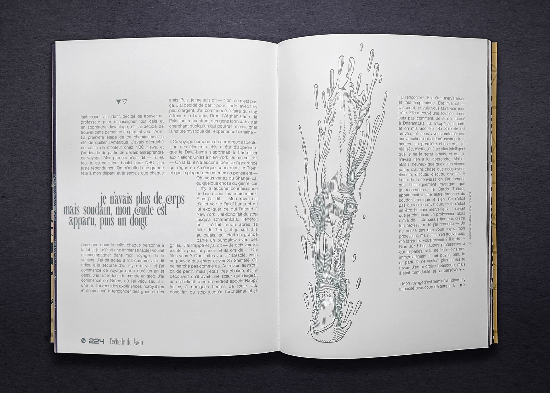Mes dessins explorent le tiraillement interne de Jacob, partagé entre le confort de son quotidien et le besoin de percer à jour les mystères (et l’horreur) de son existence. Pour accentuer ce contraste, les deux illustrations principales apparaissent comme en négatif, le vert clair des traits se détachant du fond bleu camo.