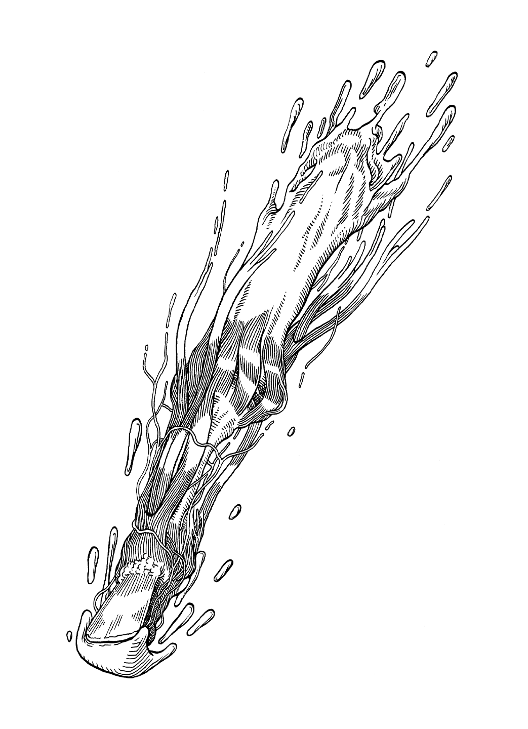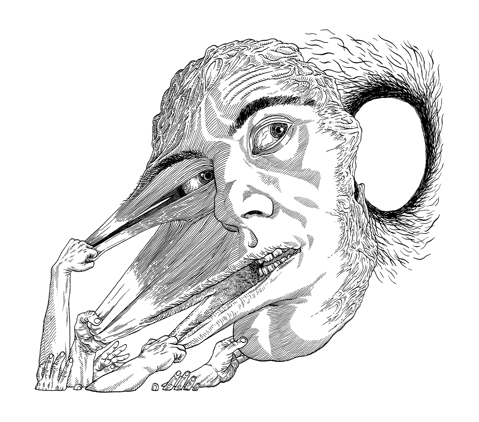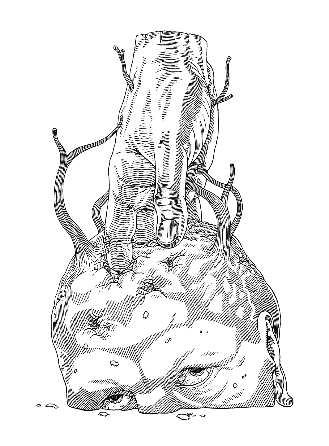 Mes dessins explorent le tiraillement interne de Jacob, partagé entre le confort de son quotidien et le besoin de percer à jour les mystères (et l’horreur) de son existence. Pour accentuer ce contraste, les deux illustrations principales apparaissent comme en négatif, le vert clair des traits se détachant du fond bleu camo.