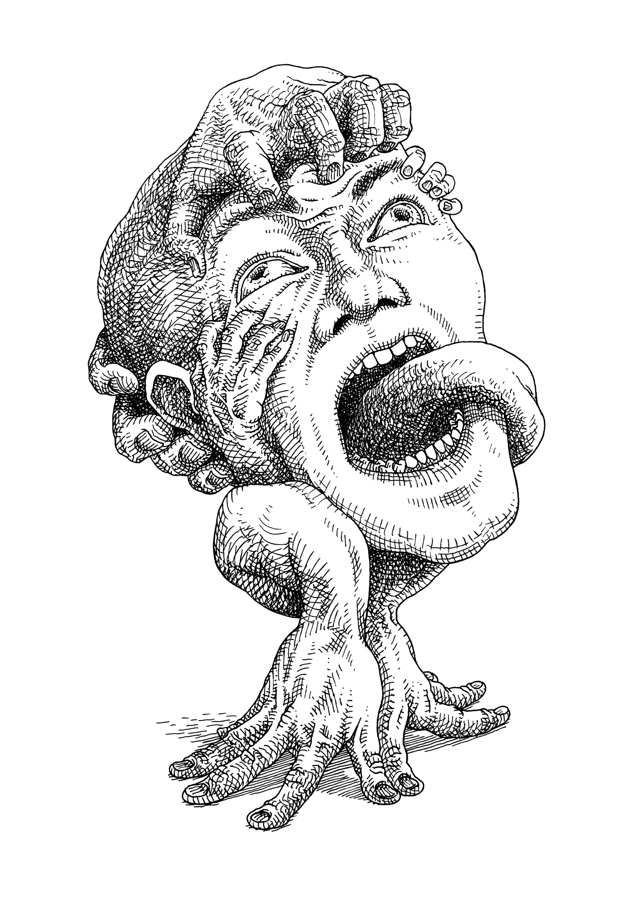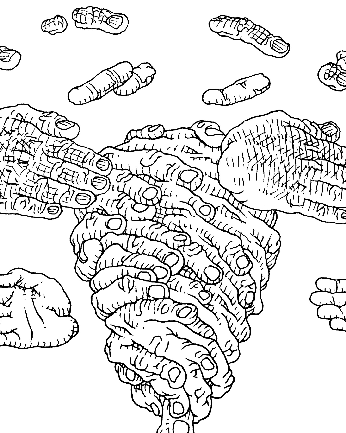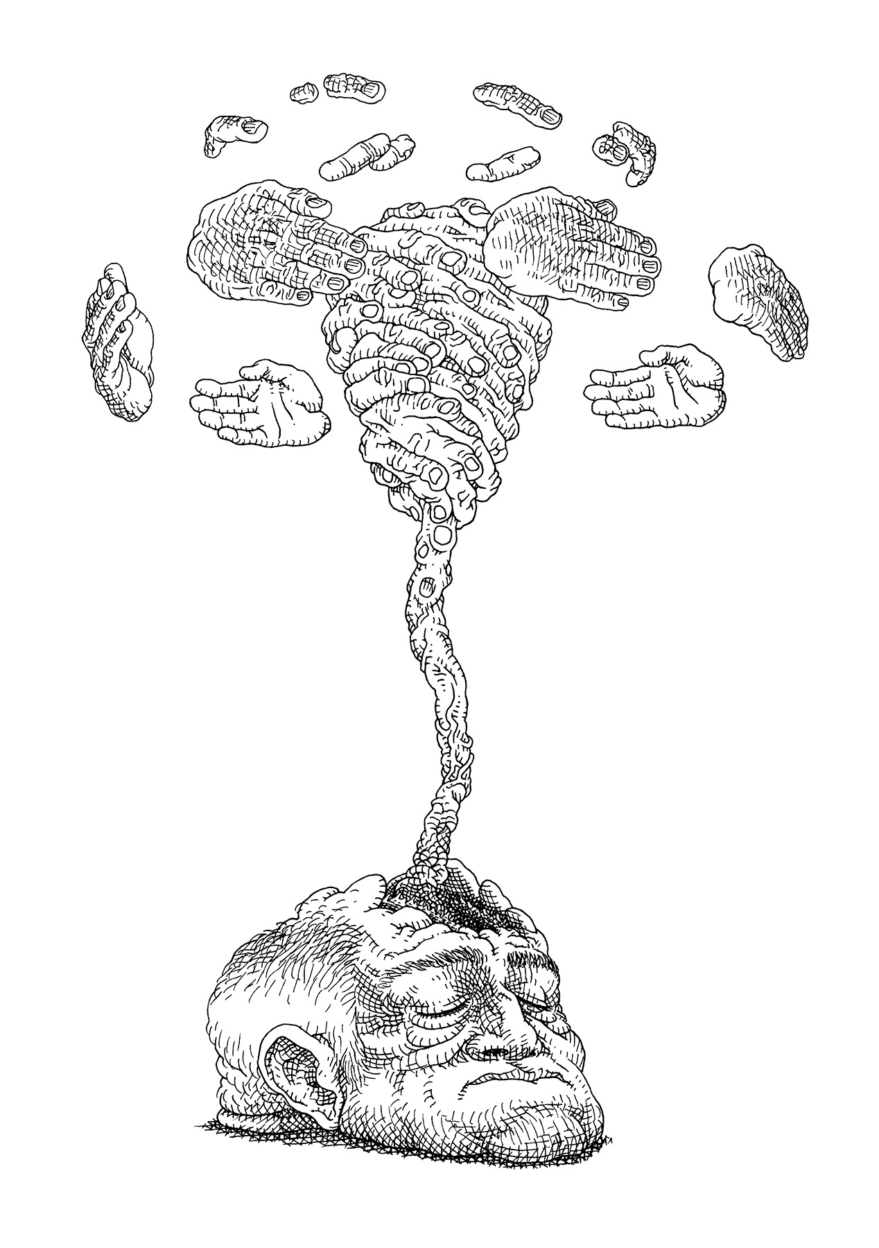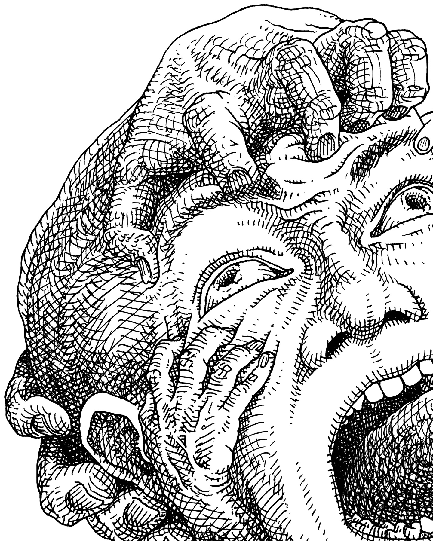 Enfin, Prolifération représente l'échec, l'abandon de la réalité en faveur d'une sécurité factice. Les pensées nocives émanent de la tête, elle-même accaparée par sa propre sauvegarde. Elles forment ensemble une colonne ombilicale reliée à un utérus digital qui couve une parodie du réel.