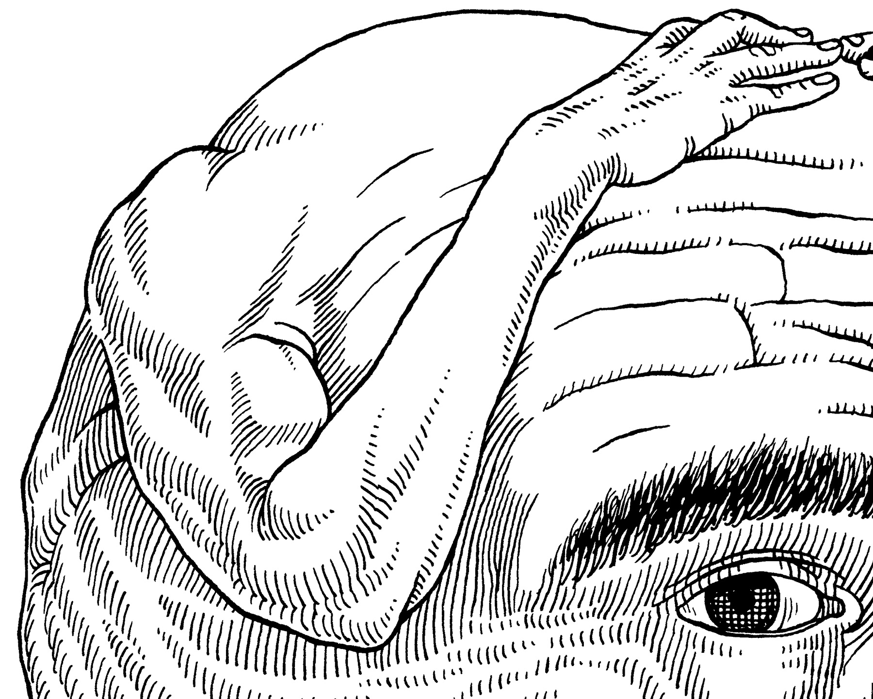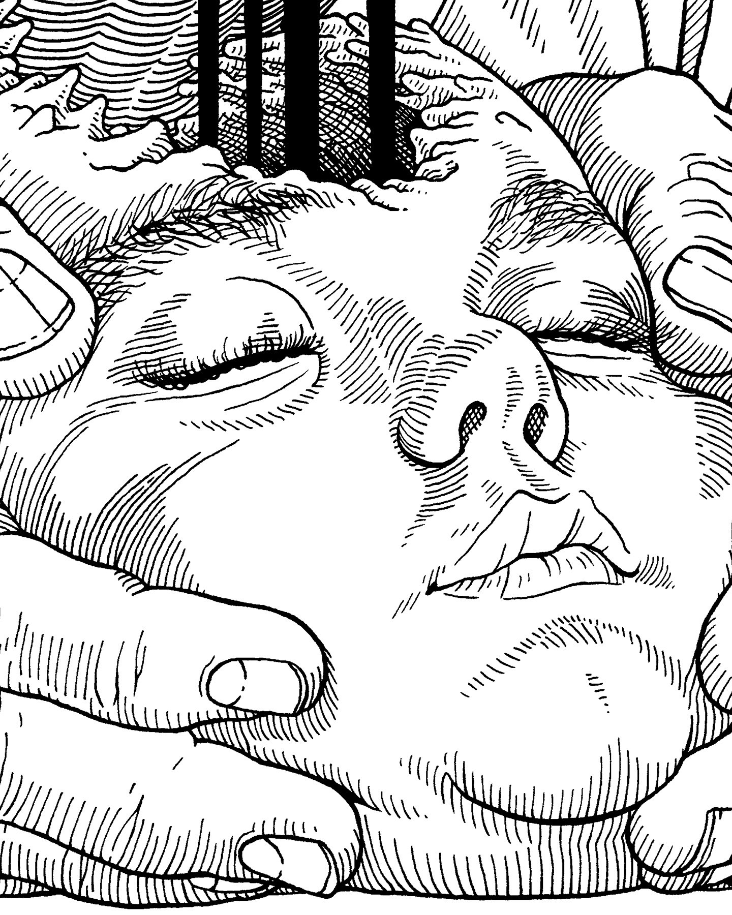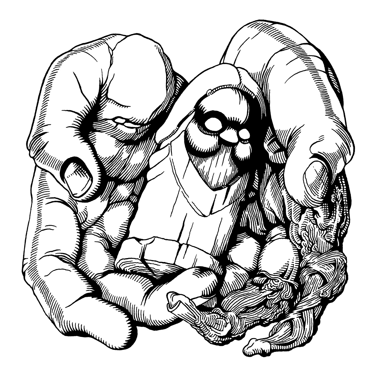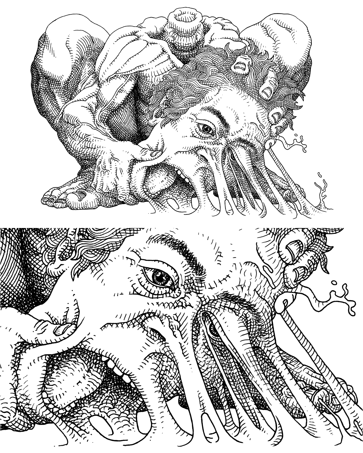 Enfin, Prolifération représente l'échec, l'abandon de la réalité en faveur d'une sécurité factice. Les pensées nocives émanent de la tête, elle-même accaparée par sa propre sauvegarde. Elles forment ensemble une colonne ombilicale reliée à un utérus digital qui couve une parodie du réel.